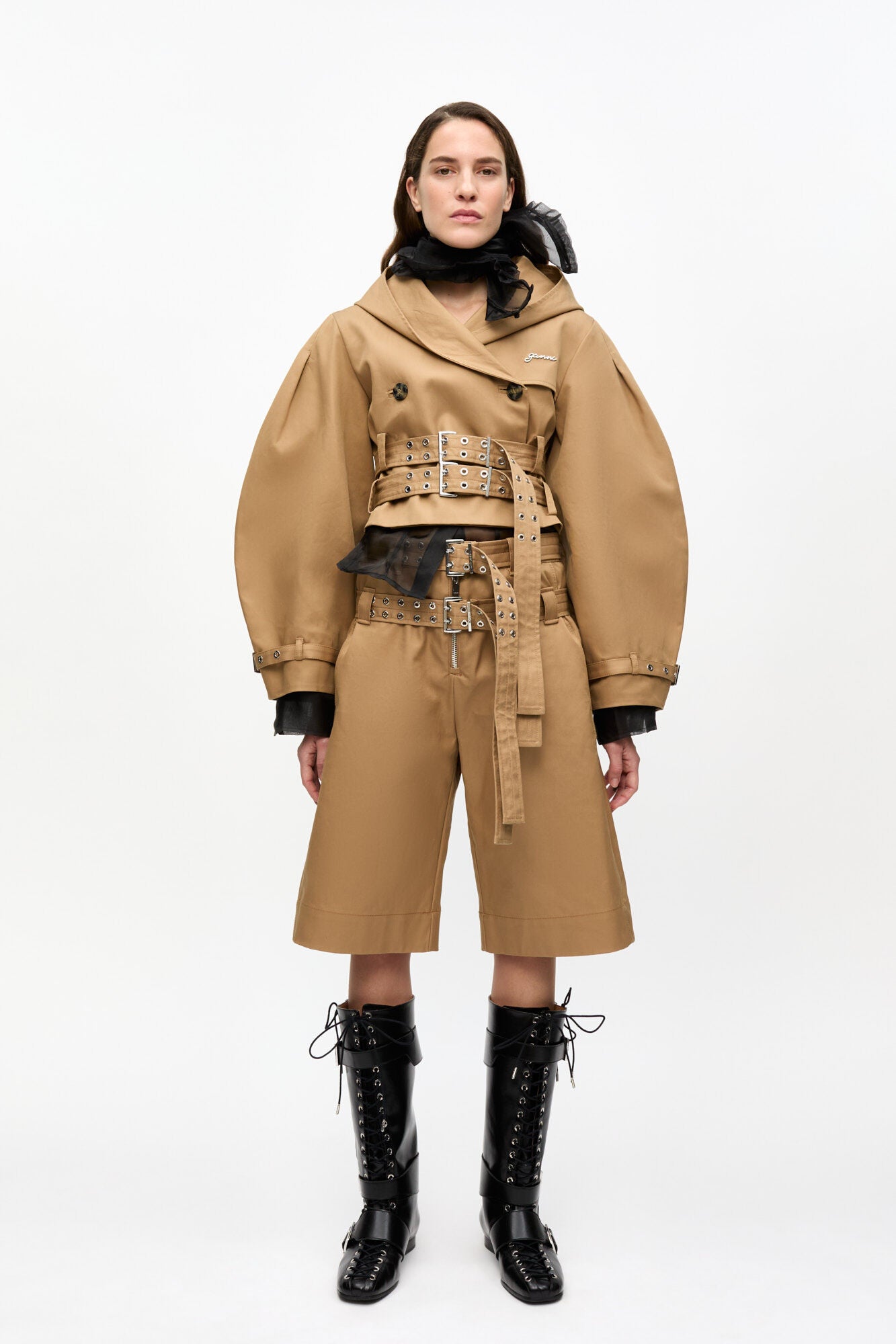 These Camel Bonded Cotton Belt Shorts feature belt loops, two matching belts with metallic eyelets and silver-tone buckles and side pockets