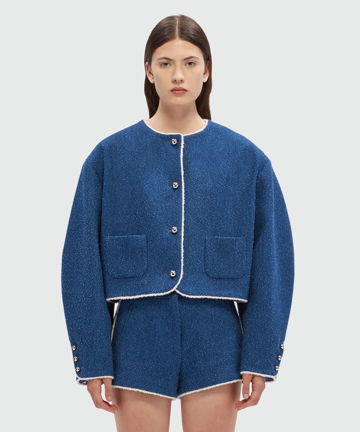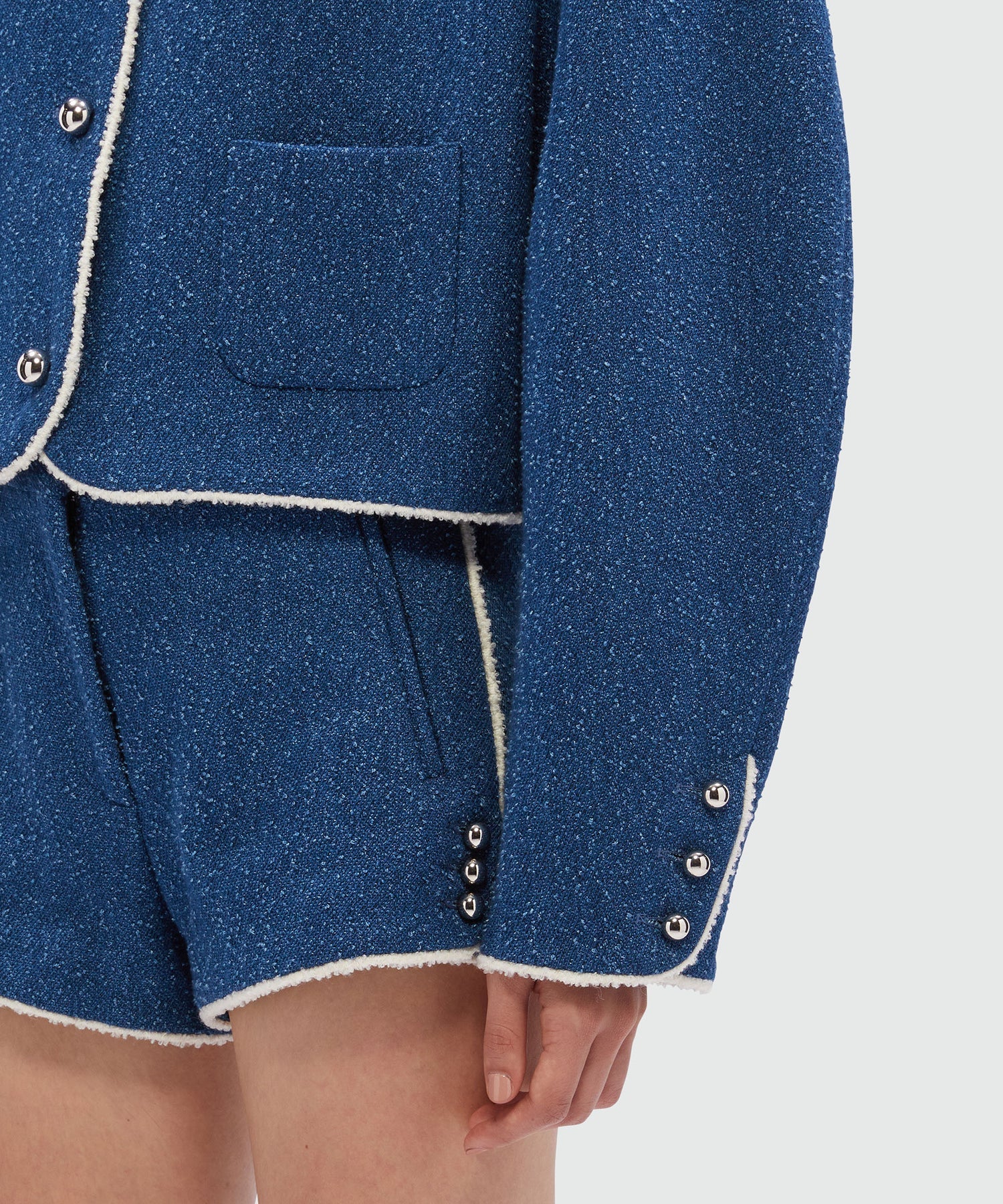 Jacket made of bouclé tweed denim characterized by oversized sleeves and profiles with contrasting colored piping. Crew neck and front closure with silver metal buttons. Patch pockets applied on the front. Cropped fit.