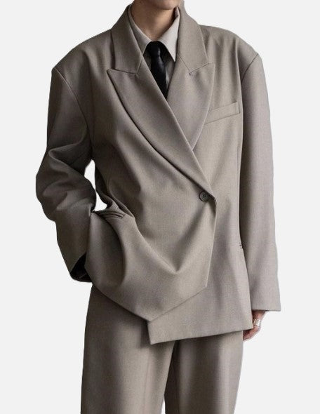 Beige Oversized Blazer, featuring a unique asymmetric hem and versatile styling options. The blazer offers two ways to button, allowing you to switch between a snatched, fitted look or a more relaxed, loose silhouette. Perfect for adding a modern twist to your wardrobe, this blazer combines structure with a chic, effortless vibe.