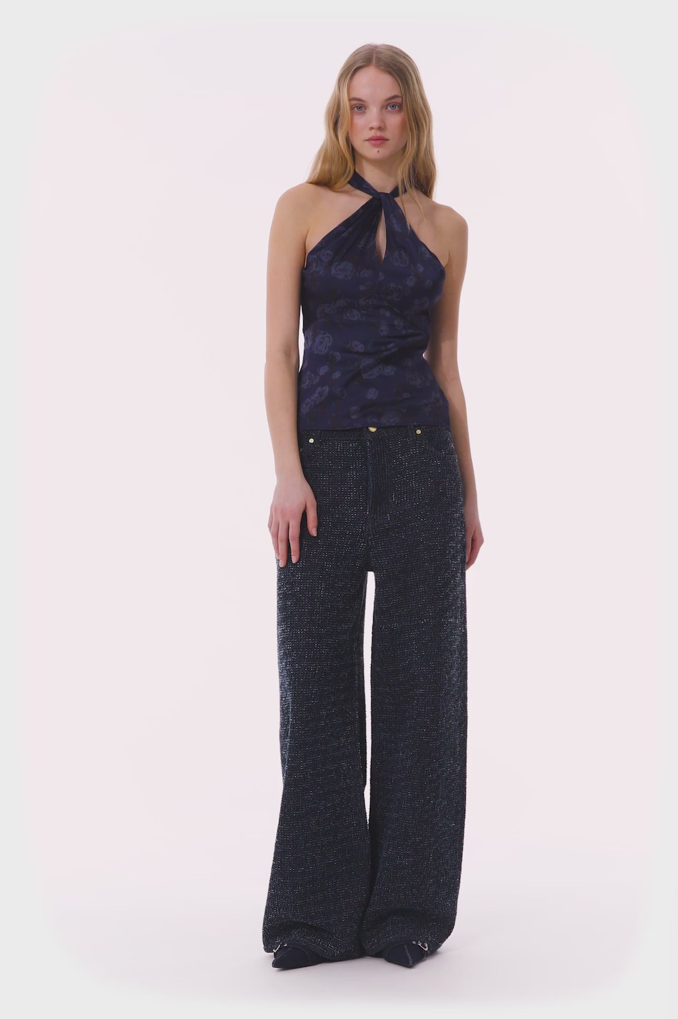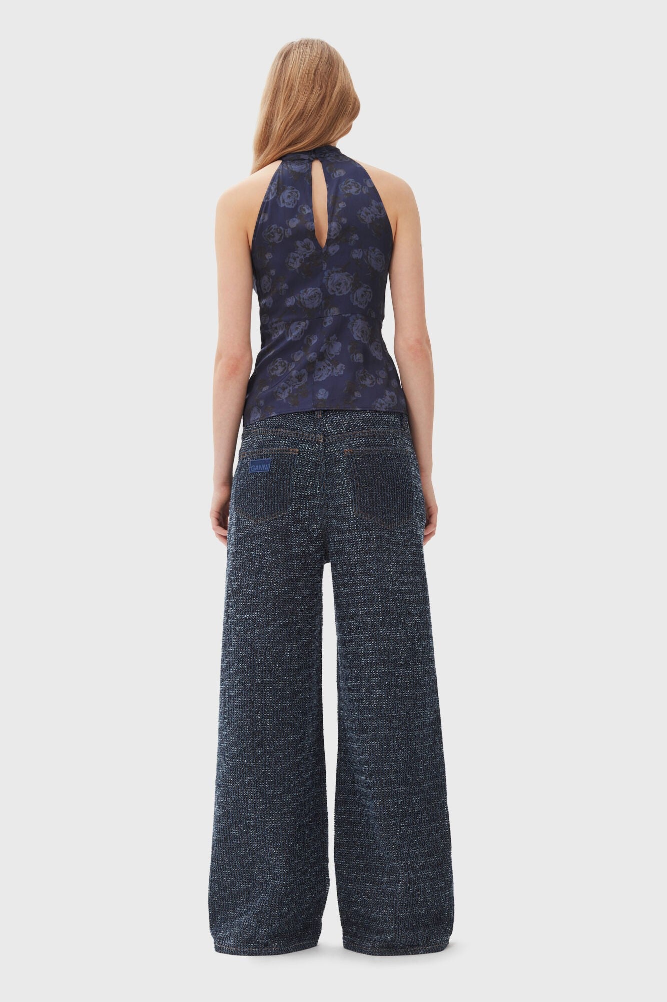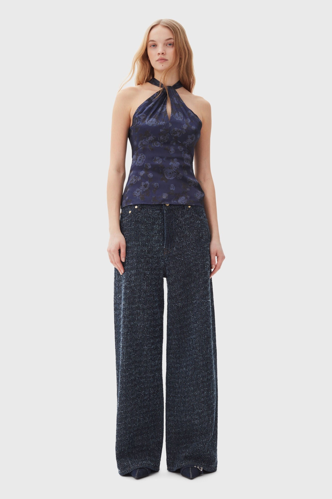 These Dark Blue Fluffy Wide Jeans feature 5 pockets with a zip and button closure and GANNI logo at the back pocket.