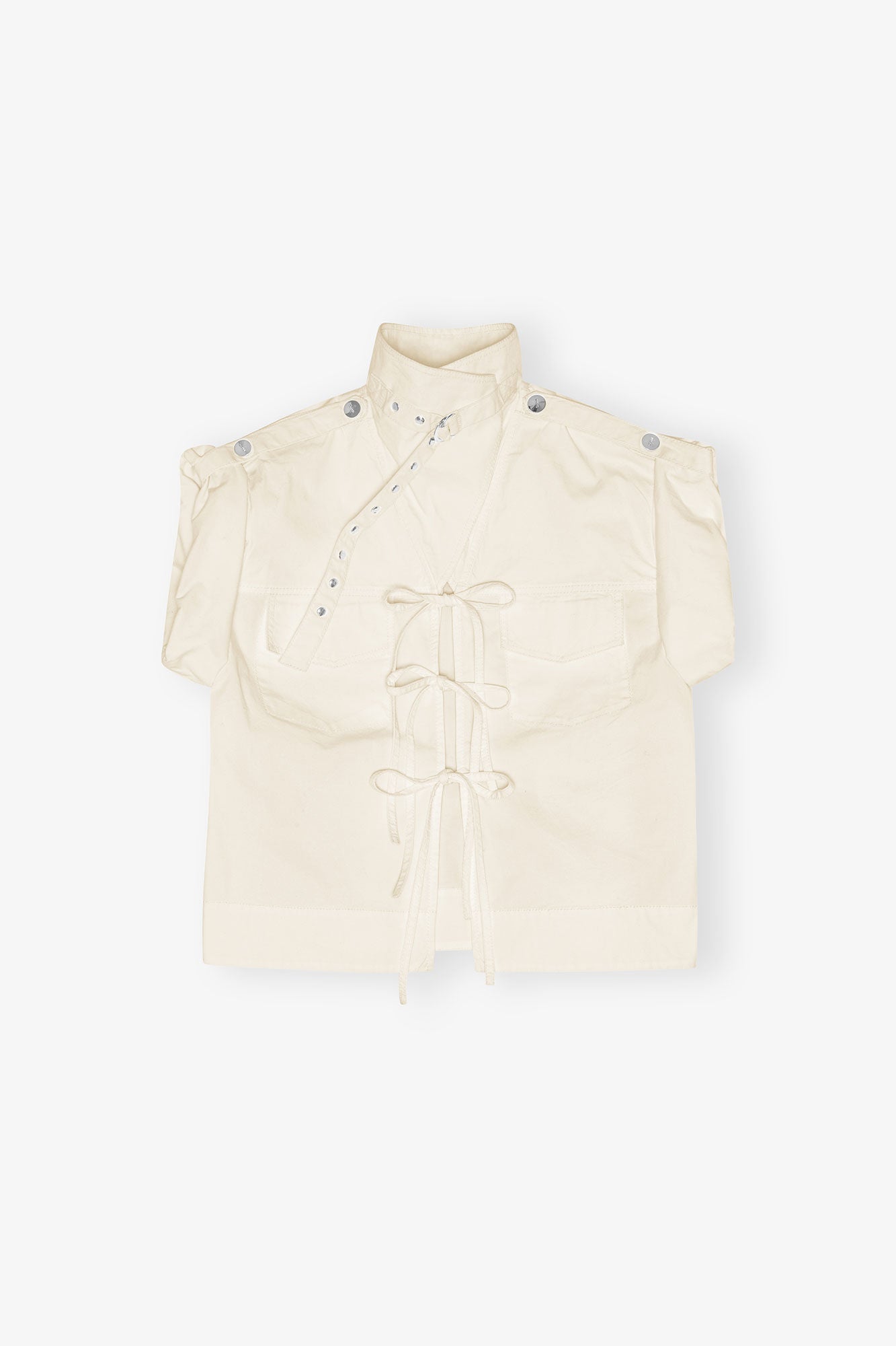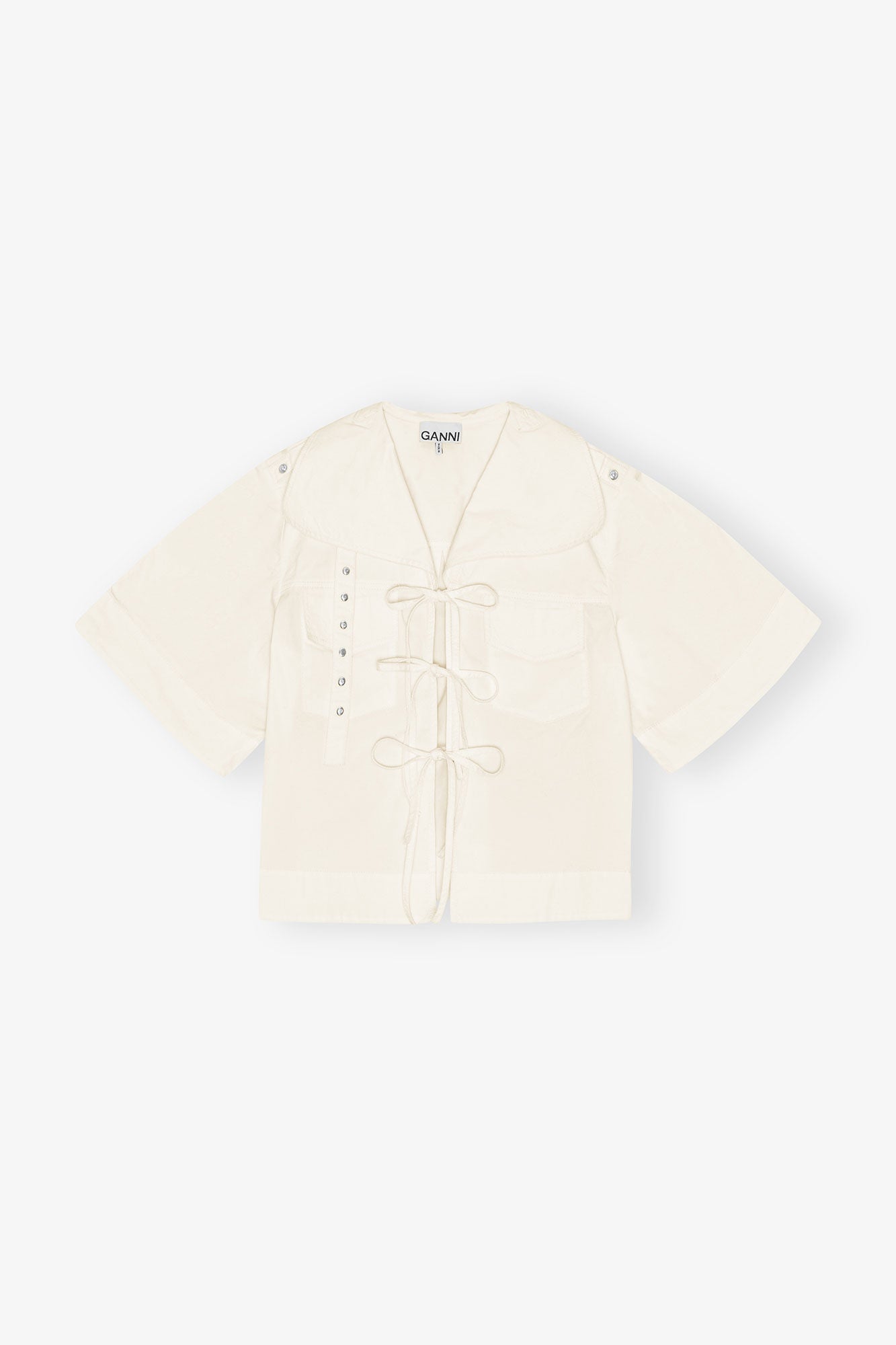This blouse features a large collar, deep v-neckline with three tie bands at the front and button shoulder details. The blouse has short adjustable sleeves and two front pockets.