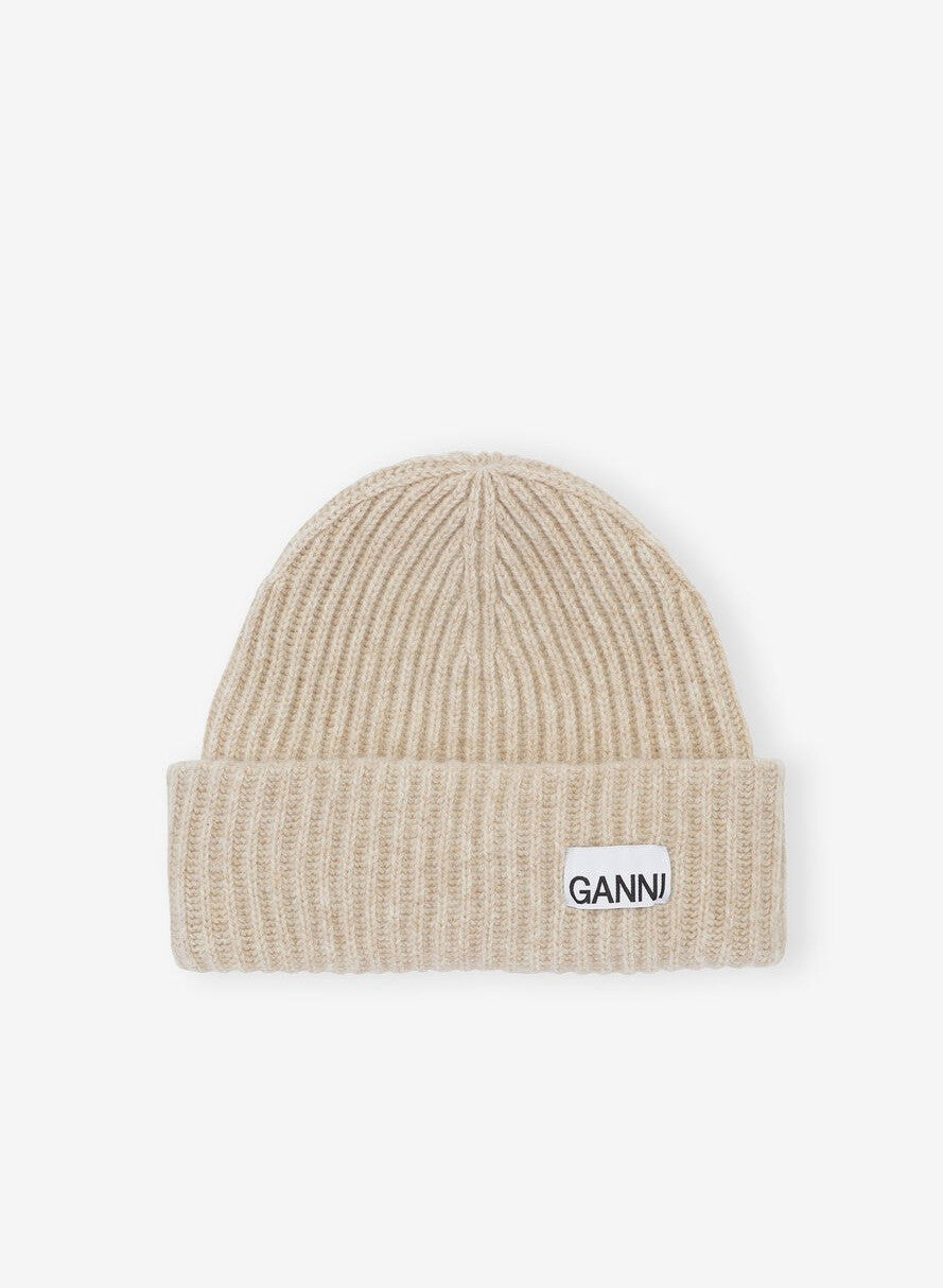 Oversized Wool Rib Knit Beanie features a GANNI logo and is made from a blend of recycled wool.