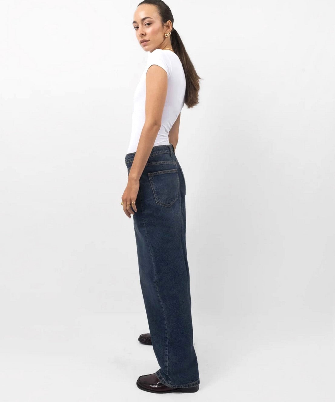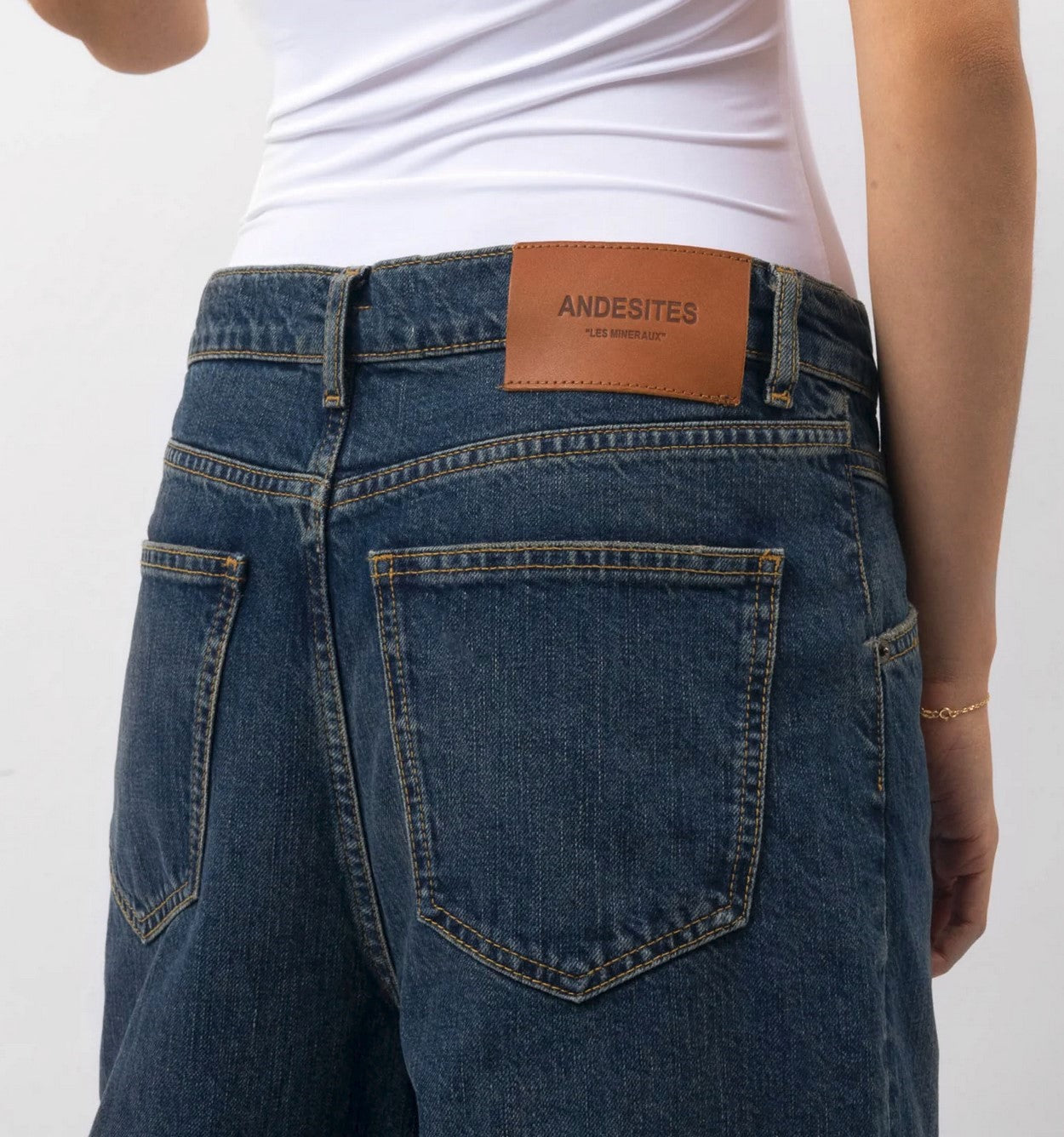 Sagesse, loose-fitting trousers, medium-high rise, made of superior denim and composed of 99% organic cotton, with the iconic ANDESITES button, side and back pockets, side cut-outs and front zip closure