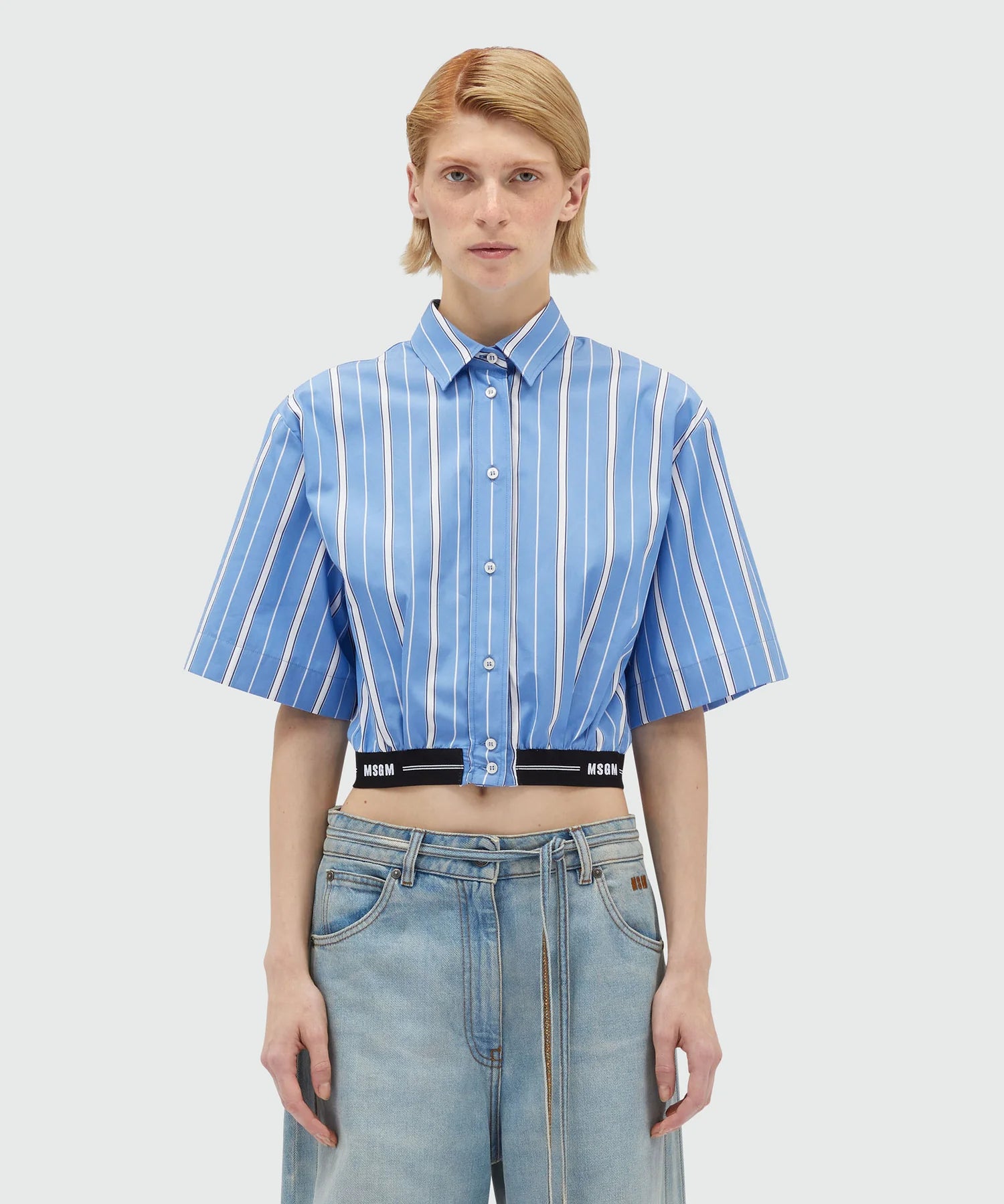 Cotton poplin shirt with stripe pattern, reduced by pleats at the bottom with MSGM elastic. Classic collar and button closure at the front. Wide short sleeves. Cropped fit.