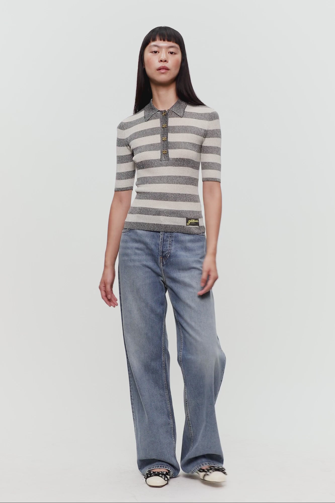 A fresh take on an everyday staple, the Striped Sparkle Rib Polo T-Shirt is designed in a form-fitting silhouette and features a striped pattern, GANNI Butterfly buttons, and metallic thread detailing throughout.