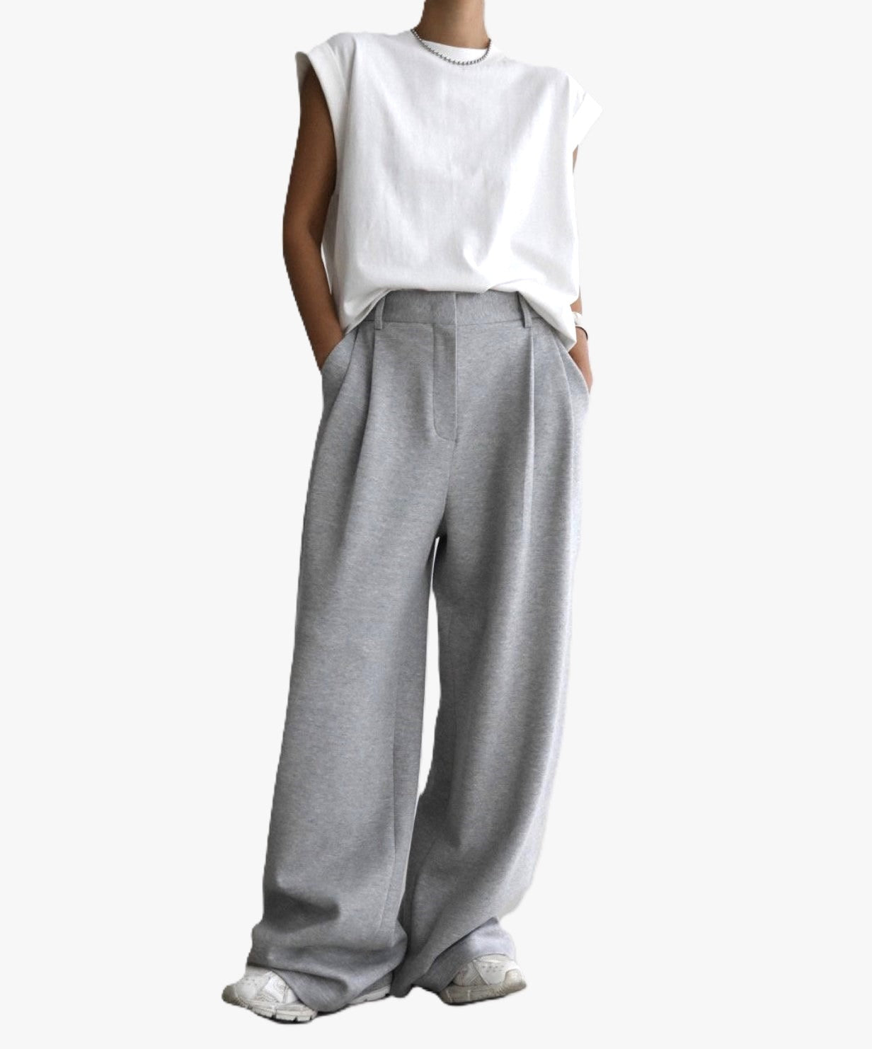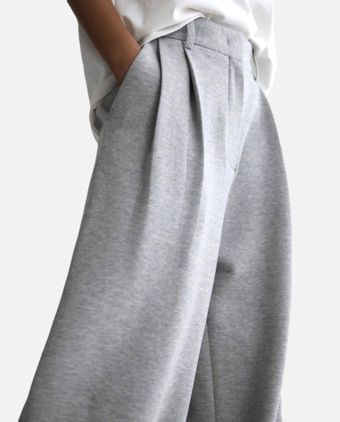Combining the comfort of sweatpants with the refined structure of pin-tuck tailoring, these trousers offer a perfect blend of casual and sophisticated. The wide-leg silhouette adds a relaxed yet fashionable vibe, while the pin-tuck detailing ensures a sleek and polished look. Ideal for everyday wear or dressy casual occasions, these trousers provide versatility and a contemporary edge to any outfit.